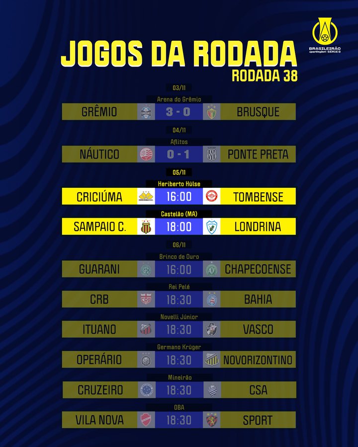 38ª rodada da Série B terá dois jogos neste sábado (5)