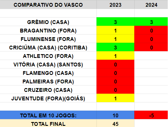 Desde a 1ª rodada do Brasileiro venho atualizando uma projetada que fiz para comparar os resultados do Vasco em 2023 e 2024. Um comparativo dos resultados contra os mesmos adversários e o mesmo mando. Nesse momento, Vasco já tem 5 pontos negativos em comparação aos resultados de 2023. No ano passado empatou com Bragantino e Fluminense fora e venceu o Coritiba em casa. Agora, três derrotas contra os mesmos adversários - o Criciúma, 3º da Série B, seria o equivalente ao Coxa, 19º da A. Ou seja, se no ano passado foi difícil, 45 pontos alcançados faltando 10 minutos para o campeonato acabar, o início em 24 liga o alerta ainda mais cedo.