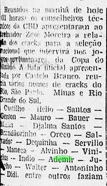 Ademir foi incluído na lista oficial da Copa do Mundo em 1954 pela CBD