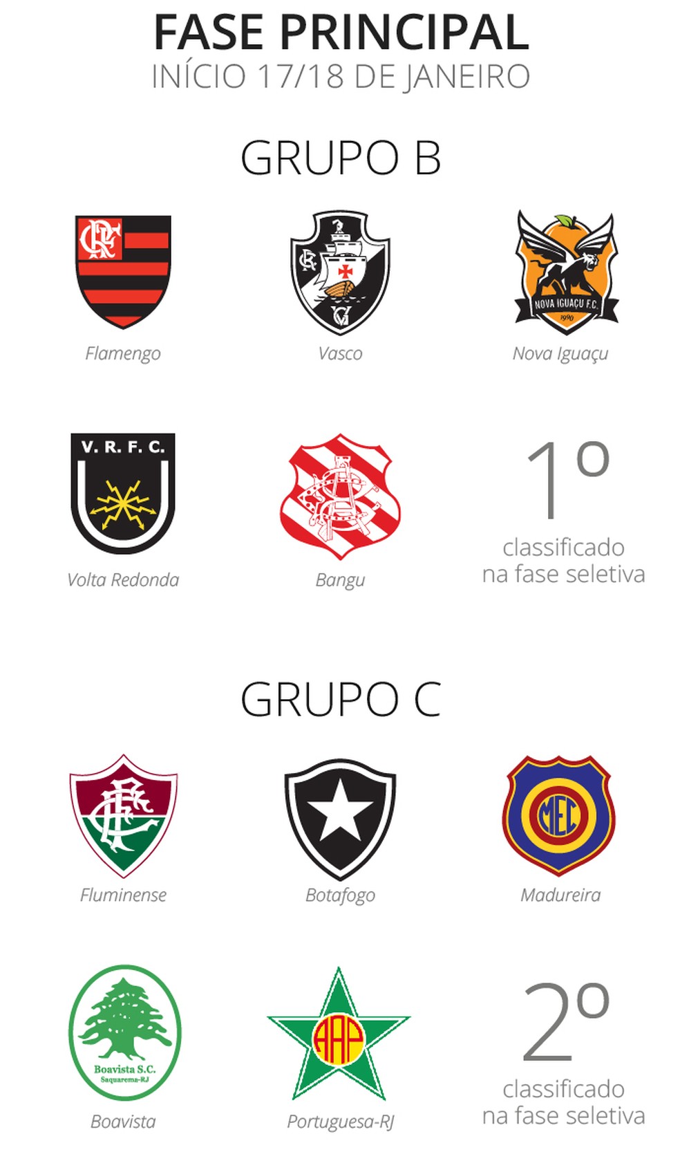 A primeira fase abre com uma seletiva entre America e Goytacaz - que subiram da Série B - e Resende, Macaé, Cabofriense e Bonsucesso - os quatro piores do Carioca de 2017. Os dois últimos dessa seletiva são rebaixados. A segunda fase, com a presença de Botafogo, Flamengo, Fluminense e Vasco, começa no dia 17 de janeiro.
