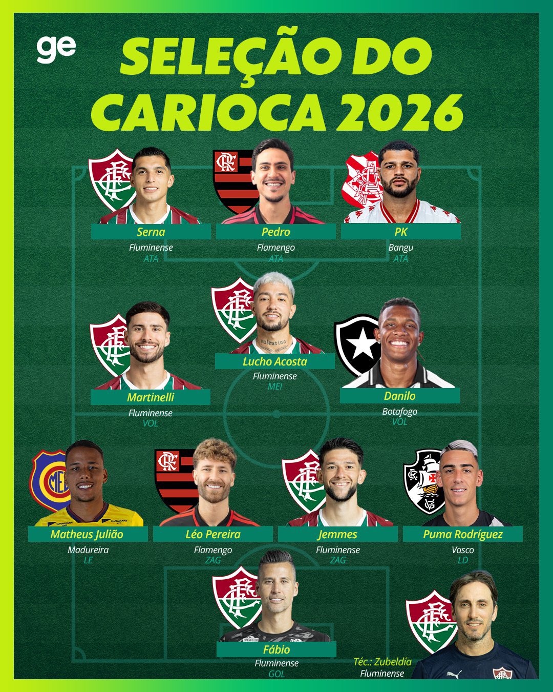 Em evento realizado em Copacabana, nesta segunda-feira (9), a orla carioca foi palco da premiação dos grandes nomes do Campeonato Carioca. A seleção da competição foi escalada com um equilíbrio entre nomes jovens e experientes, contando com Fábio no gol; uma linha defensiva formada por Pumita, Jemmes, Léo Pereira e Matheus Julião; o meio-campo composto por Danilo, Martinelli e Lucho Acosta; e o ataque com Serna, PK e Pedro.