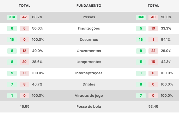 Pontos que considero positivos: - Redução do número de cruzamentos, embora 20 ainda seja um número alto. - Apenas 18 perdas de posse de bola, contra 30 do Brusque. Destaque negativo vai novamente para o excesso de lançamentos errados (20).
