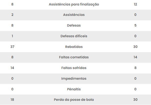 As estatísticas da partida mostram que o Vasco teve menos posse de bola, finalizou menos vezes à meta adversária, mas foi mortal nas chances que teve. Destaque para Nenê, que concluiu perfeitamente as duas oportunidades de gol em seus pés.