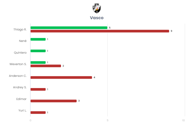 O mapa de calor do Vasco indica uma predominância dos ataques pelo setor esquerdo. Edimar cumpriu bem a função e merece destaque pelo belo passe para Getúlio na jogada do 2º gol. Gabriel Pec fez uma partida digna de elogios. Teve êxito no duelos 1x1 e foi assertivo nas decisões.