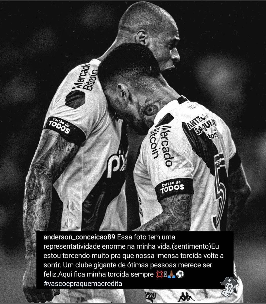 Anderson Conceição postou uma mensagem de apoio a torcida do Vasco pelo momento vivido.