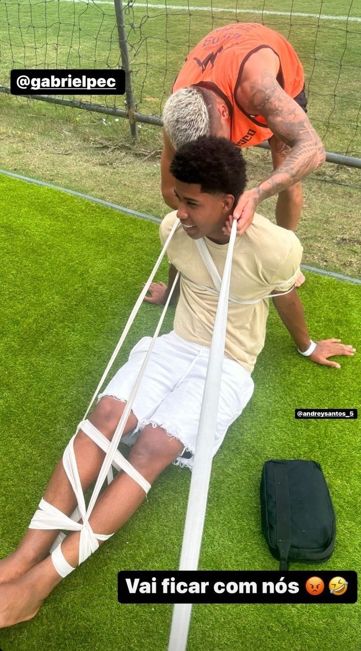 Andrey Santos é 'amarrado' por companheiros no CT; foto