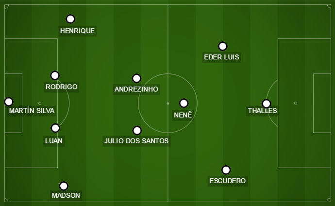 Dos 11 que começaram jogando uma semana antes, apenas seis estavam também na equipe titular deste domingo: Martín Silva, Luan, Rodrigo, Nenê, Escudero e Thalles.