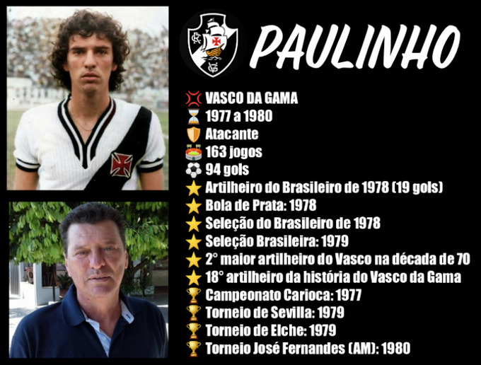 Hoje é aniversário do craque Paulinho (65 anos), dos grandes parceiros de ataque do ídolo Dinamite, campeão em 77, artilheiro do Brasileiro de 78 e 2° goleador do Vasco nos anos 70. Atualmente mora em sua terra natal (Piracicaba-SP), dono de escolinha de futebol e é vascaino!🎂💢