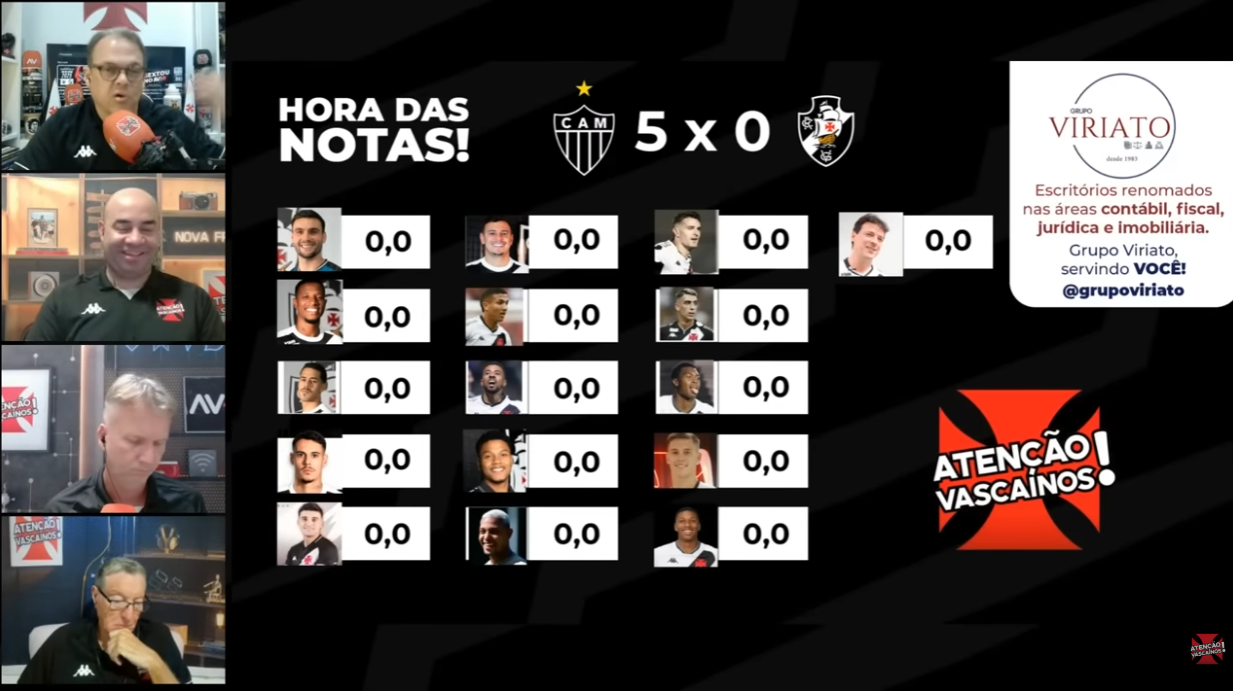 Canal Atenção Vascaínos avaliou a atuação do Vasco, na goleada sofrida pelo Atlético-MG, no último domingo (07), na Arena MRV, por 5 a 0. Em protesto ao vexame, os jornalistas deram nota zero a todos os jogadores.