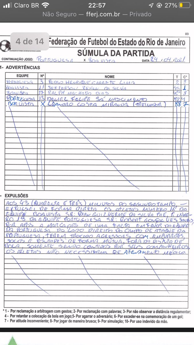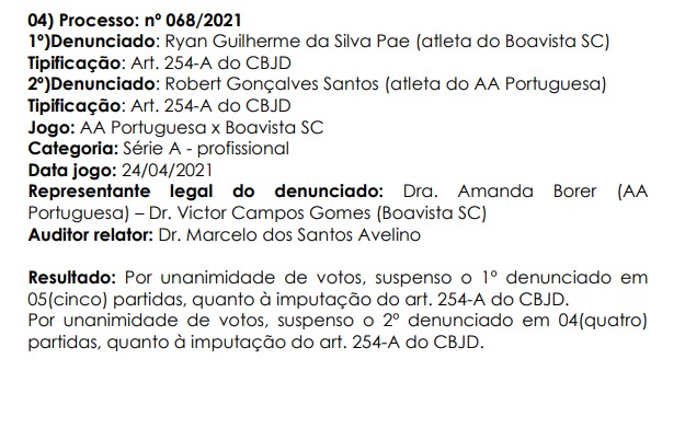 Um mês depois, em 24 de maio de 2021, a 5ª Comissão Disciplinar do TJD-RJ julgou e suspendeu Ryan em cinco jogos. +