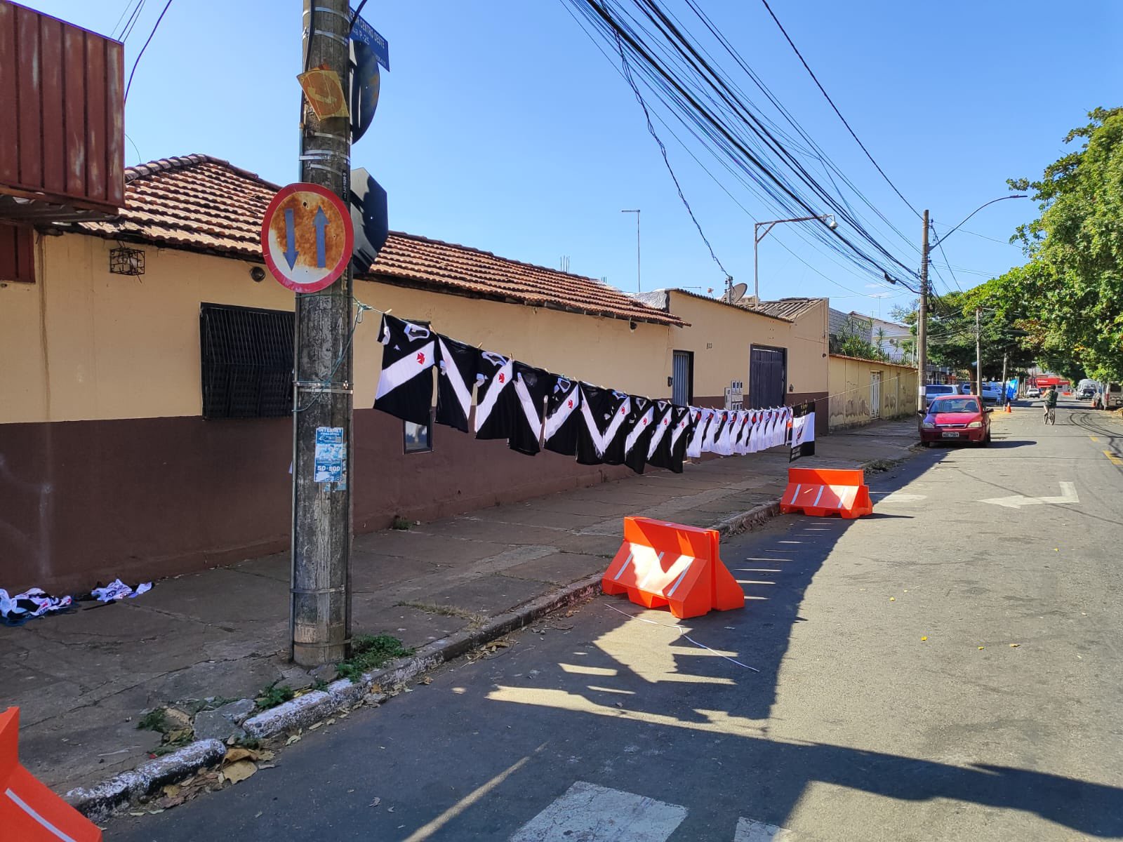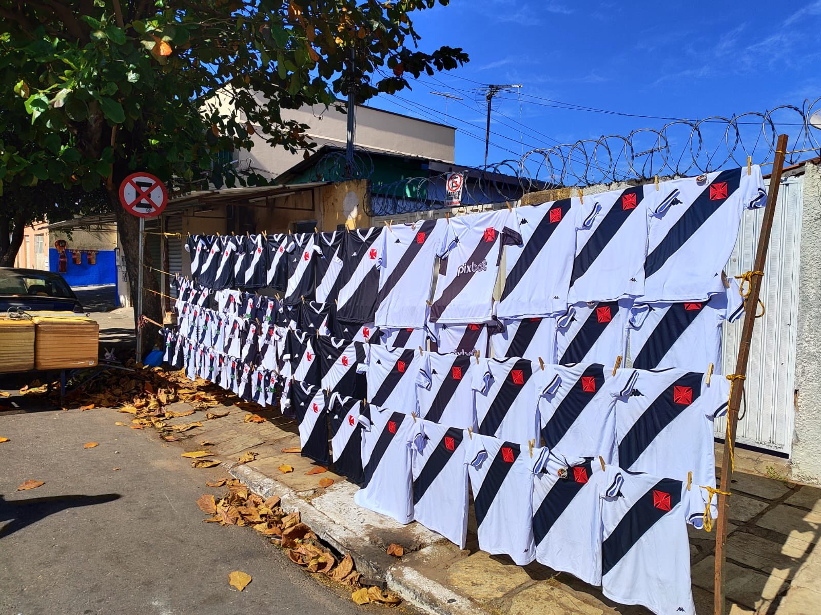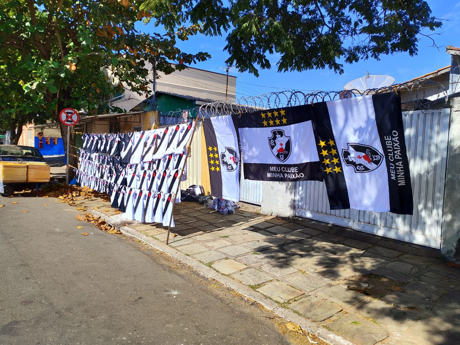 Muitas bandeiras e camisas sendo vendidas do lado de fora do Estádio Antônio Accioly.