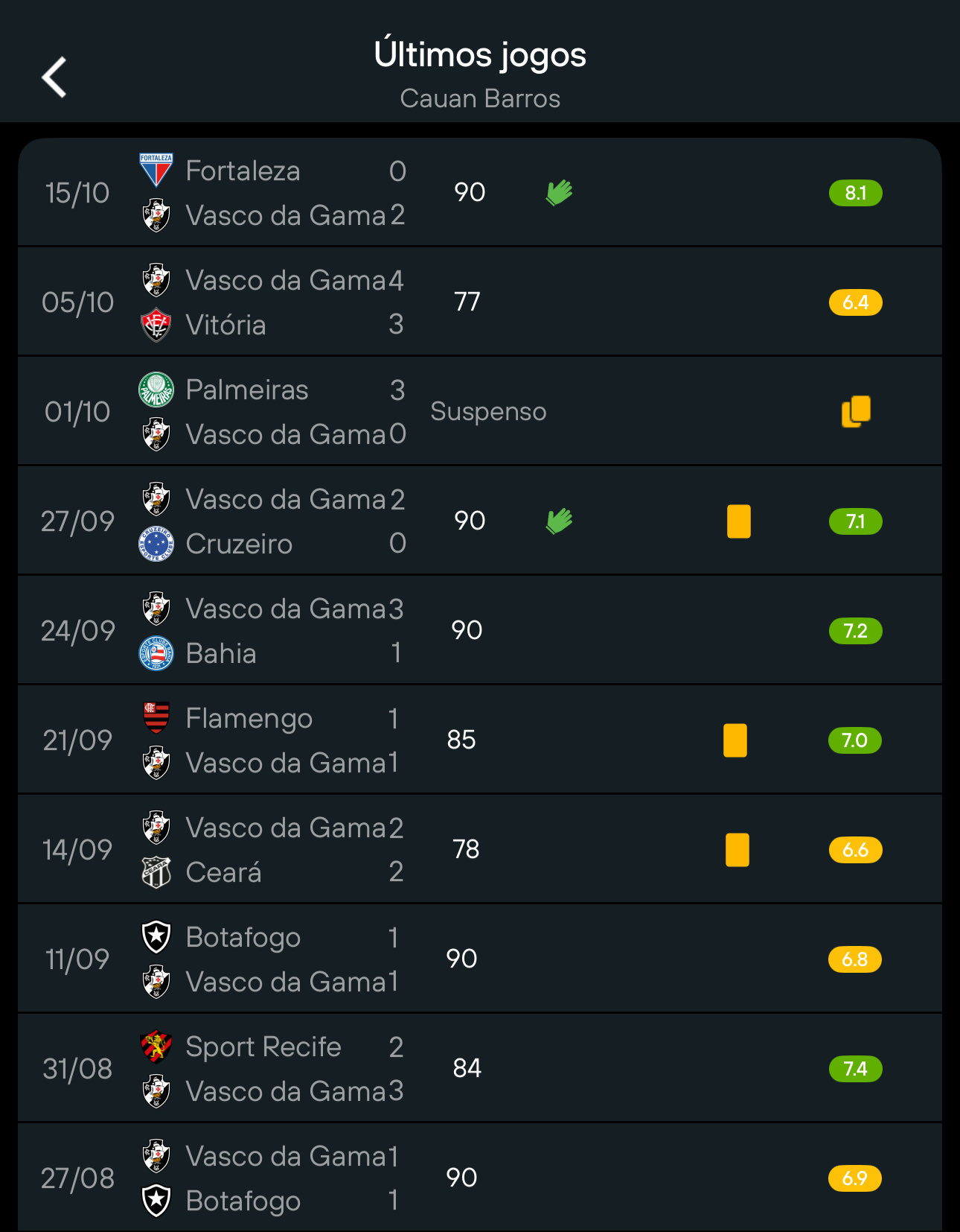 Cauan Barros segue sem perder desde que virou titular no Vasco. A derrota para o Palmeiras por 3 a 0 no Allianz Parque aconteceu quando ele estava suspenso.