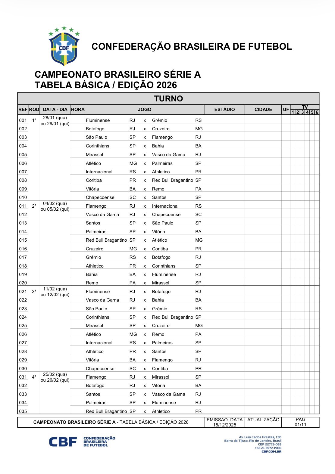 CBF divulga Regulamento Específico e tabela básica de todas as rodadas do Brasileirão 2026