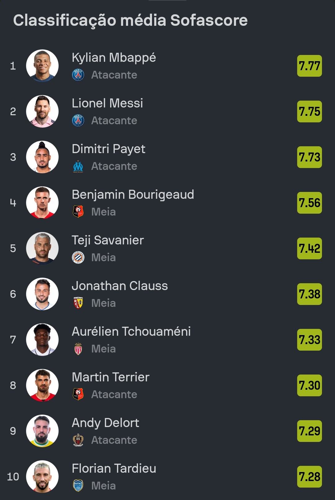 Classificação média do SofaScore mostra Payet atrás apenas de dois astros
