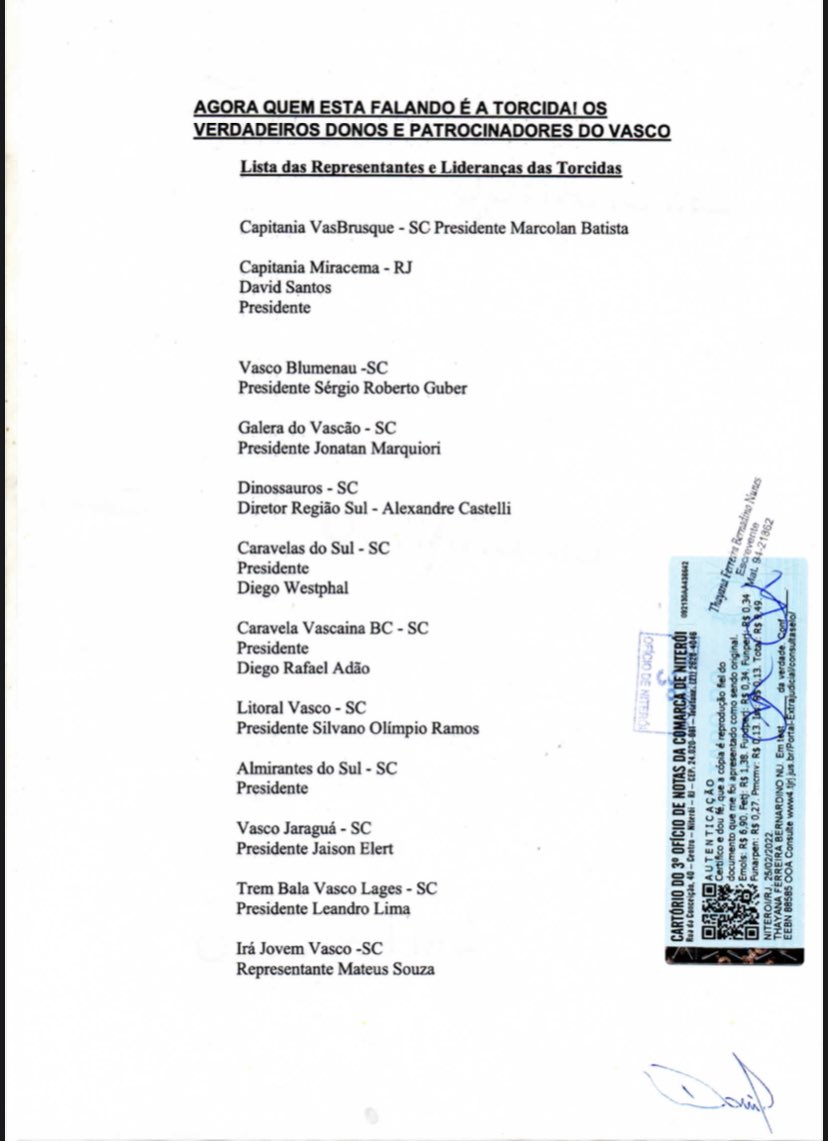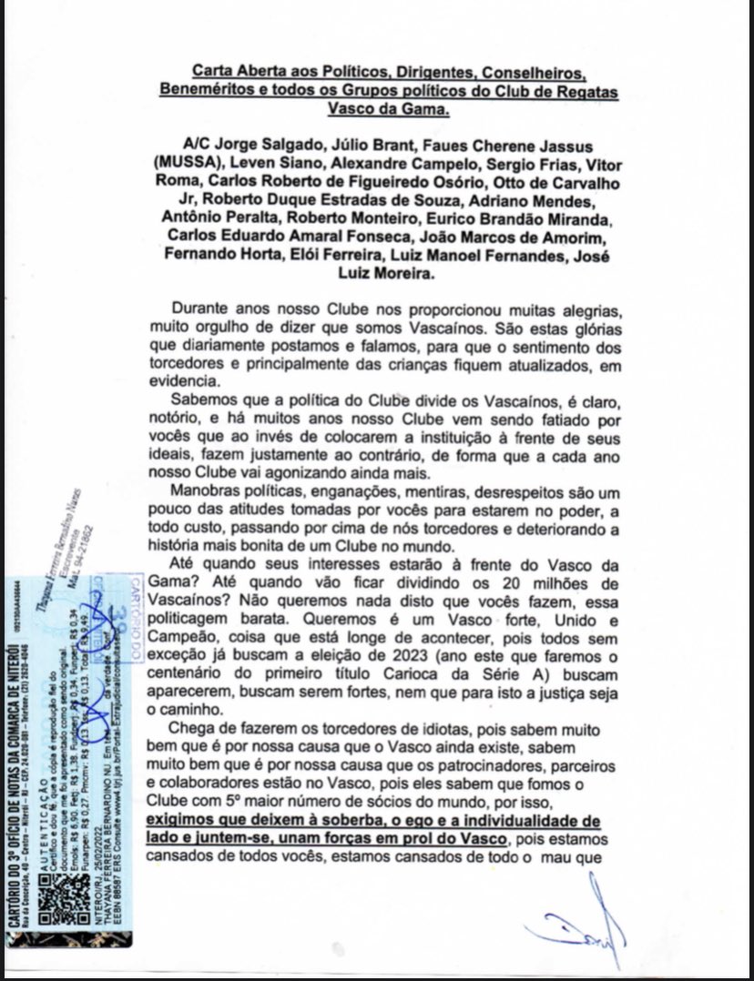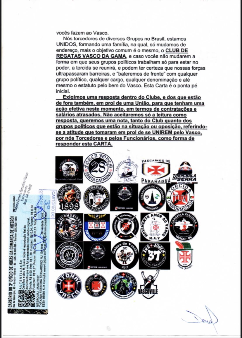 Um grupo de torcedores do Vasco, com torcidas do Rio e Off Rio, que declara não ter nenhum fim político, registrou uma carta na secretaria do clube pregando a união de todas as frentes vascaínas. Confira o conteúdo: