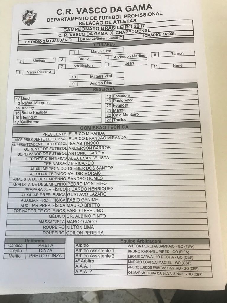 Confira a escalação oficial do Vasco, Zé Ricardo mantém Pikachu no time