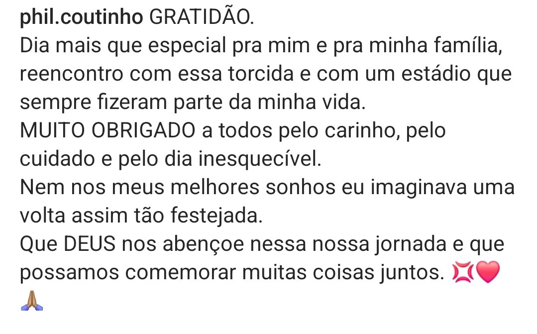 Dia mais que especial pra mim e pra minha família, reencontro com essa torcida e com um estádio que sempre fizeram parte da minha vida.
