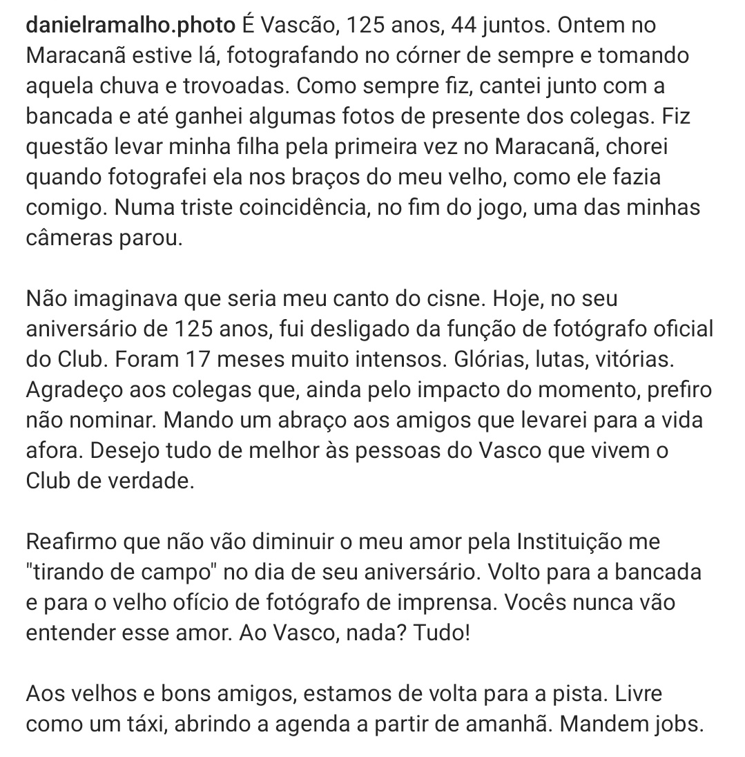Daniel Ramalho não é mais o fotógrafo do Vasco