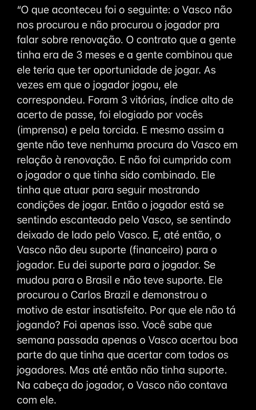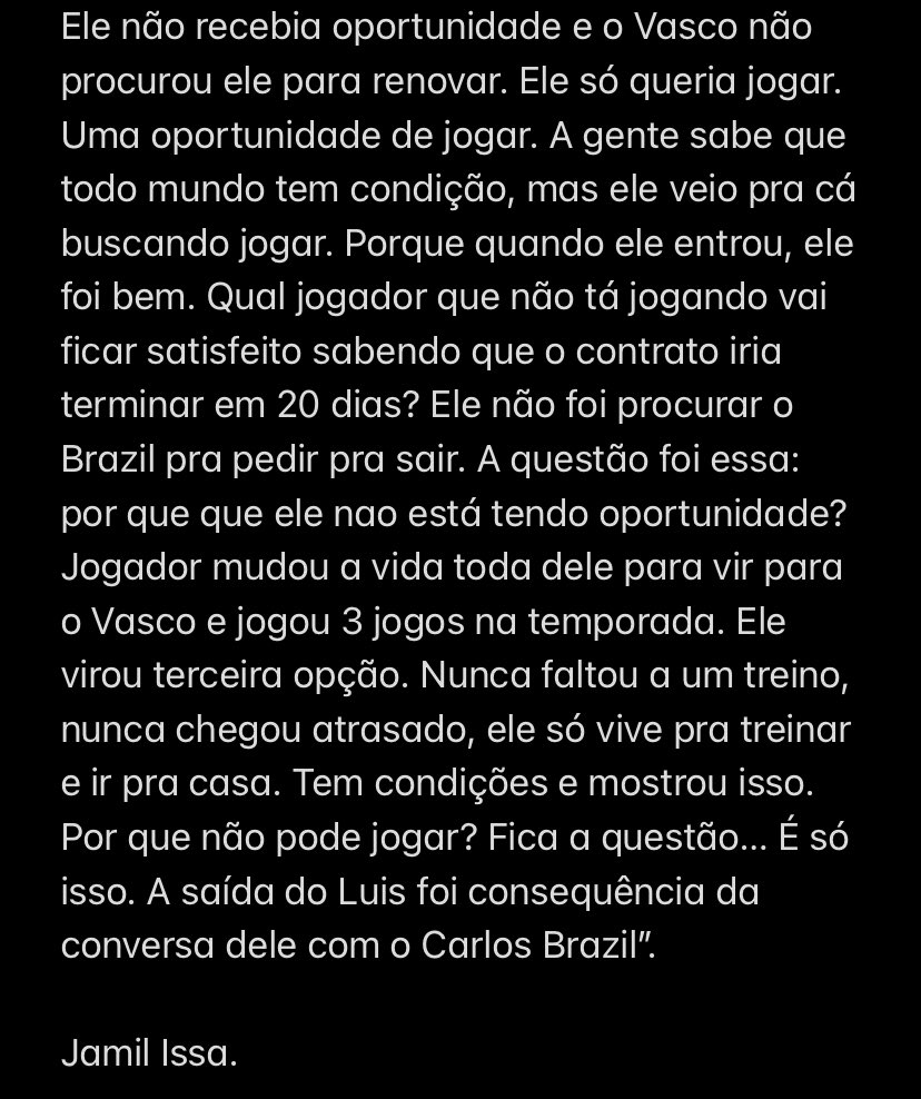 Em entrevista exclusiva para mim, o empresário de Luis Cangá, Jamil Issa, deixou claro o que aconteceu para que o jogador não continuasse no Vasco. O representante frisou que em momento algum o zagueiro pediu para sair. Ele só queria mais oportunidades por ter jogado pouco. Veja: