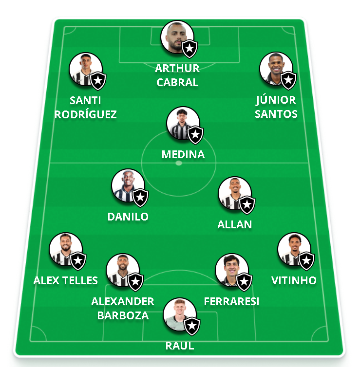 Provável escalação: Raul; Vitinho, Ferraresi, Barboza, Alex Telles; Allan, Danilo, Medina; Santi Rodríguez (Edenilson), Júnior Santos, Arthur Cabral.