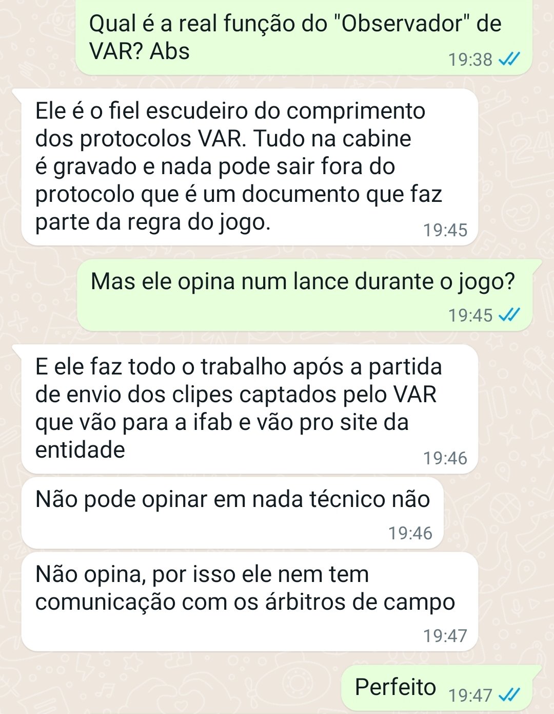 Tem algumas pessoas confundindo a função do Observador de VAR. Como na escala de arbitragem para o clássico de amanhã apareceu o "polêmico" Pericles Bassols nessa função, vi muitos torcedores assustados e com razão. Fui tirar dúvida com um árbitro de VAR. Confira: