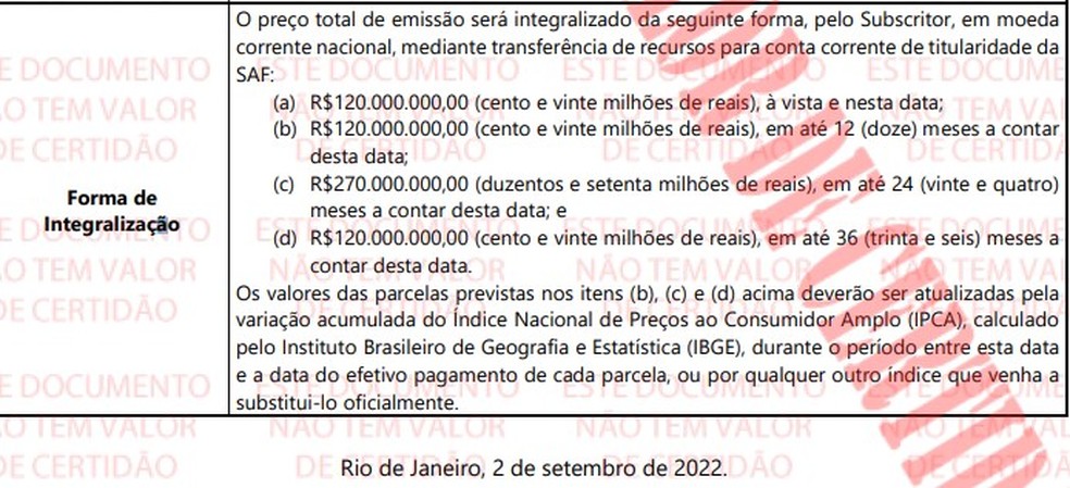 Para integralizar os 51% restantes, a empresa precisa cumprir com os demais pagamentos. Depositados os R$ 120 milhões esta semana, a 777 recebe mais 12% de participação na SAF.