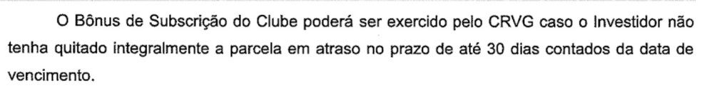 O contrato prevê que, "caso o investidor não pague no prazo e condições estabelecidas, o CRVG poderá exercer seu bônus de subscrição, diluindo a participação do investidor até o montante necessário para que este passe a ter participação proporcional aos valores integralizados".