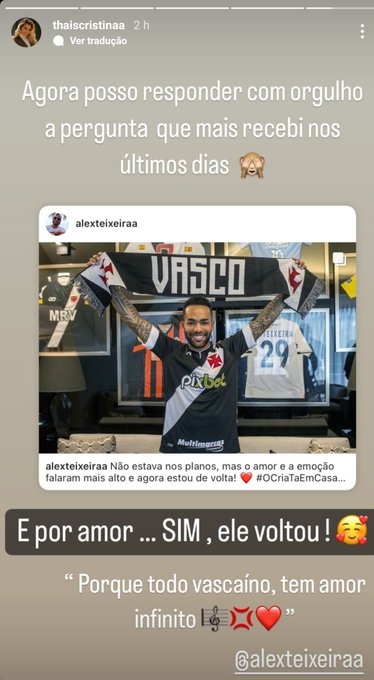 Esposa de Alex Teixeira comemora volta do jogador para o Vasco