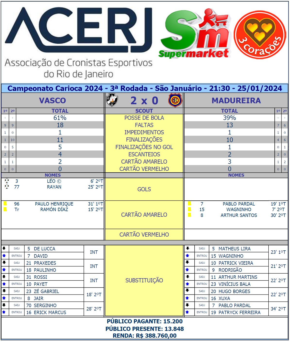 Scout Final de Vasco e Madureira pela 3ª Rodada do Campeonato Carioca 2024 em São Januário