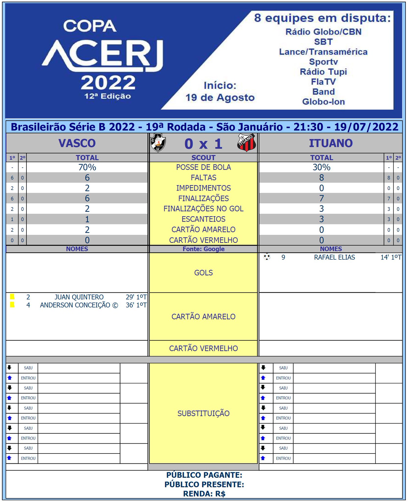 Scout do 1º Tempo de Vasco e Ituano pela 19ª Rodada do Campeonato Brasileiro da Serie B 2022 em São Januário (Fonte: Google)