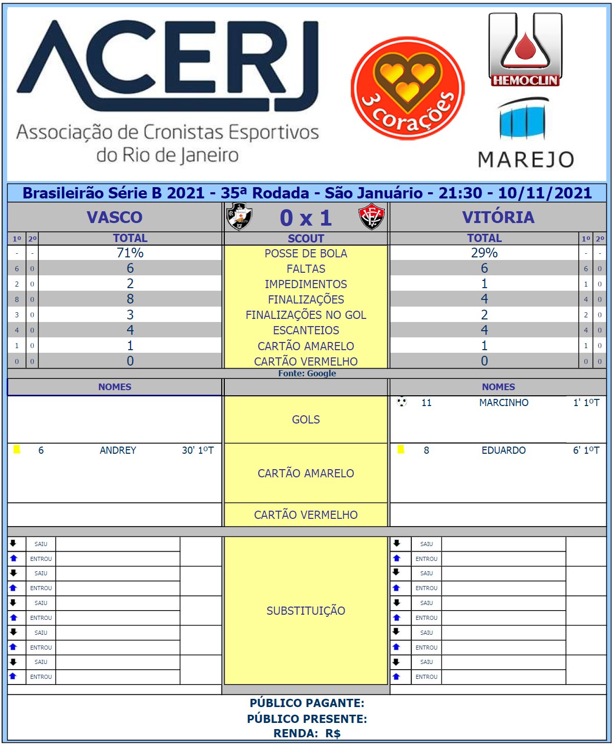 Scout do 1º Tempo de Vasco e Vitória pela 35ª Rodada do Campeonato Brasileiro da Série B 2021 em São Januário (Fonte: Google)