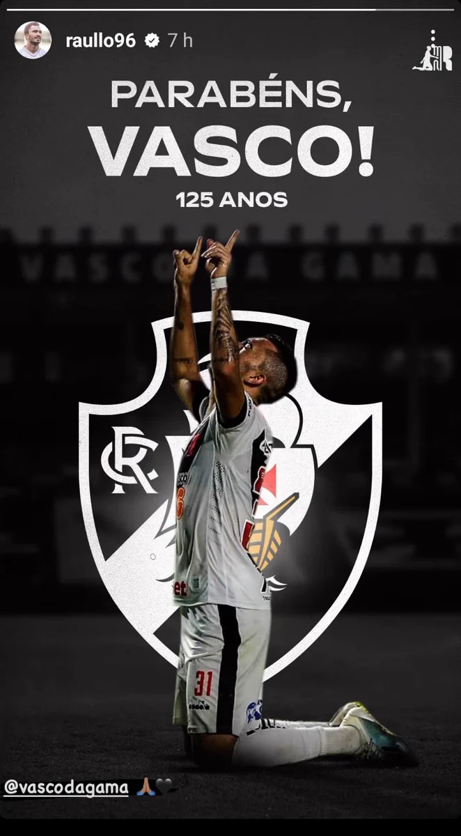 O volante Raul, ex Vasco, parabenizou o Cruzmaltino através do Instagram.
