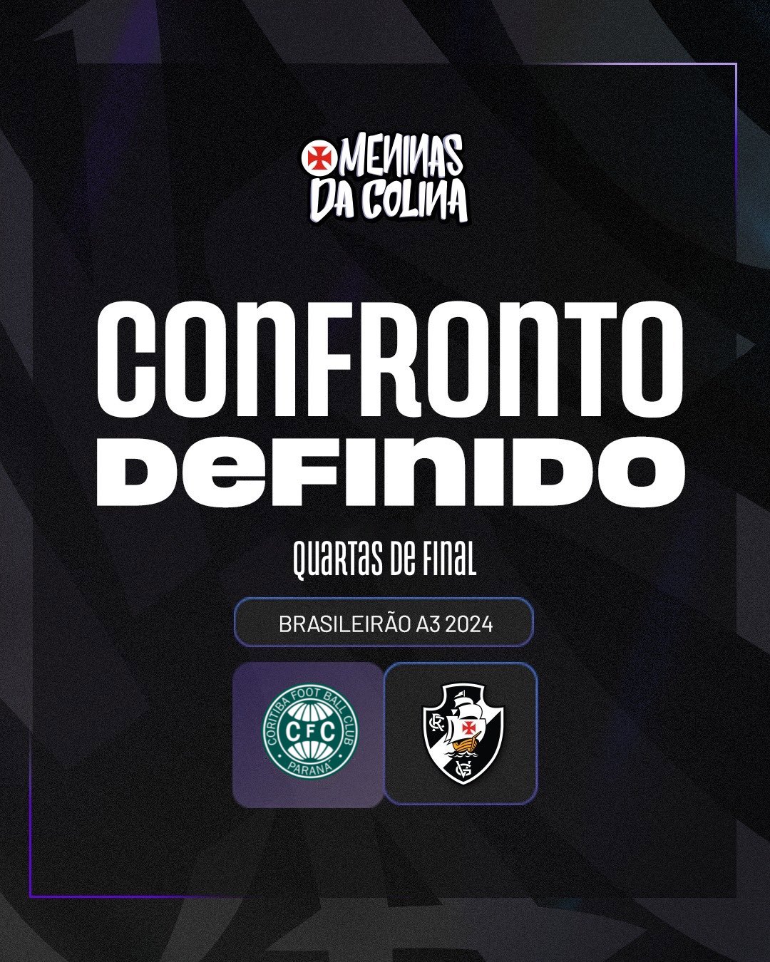 O Vasco enfrentará o Coritiba nas quartas de finais do Brasileiro A3. O jogo de ida será realizado no próximo domingo, às 15h, em São Januário. Vamos juntos pelo acesso! 💢 #MeninasDaColina #VascoDaGama