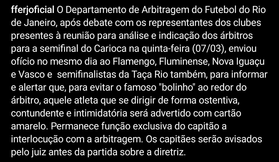 📲 | A FERJ emitiu um comunicado oficial avisando aos times semifinalistas do Campeonato Carioca e Taça Rio para evitar o “bolinho” ao redor dos árbitros para reclamações.