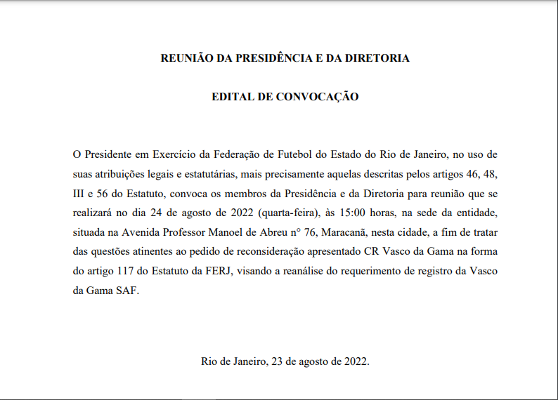 Diretoria da Ferj volta a se reunir amanhã para tratar "das questões atinentes ao pedido de reconsideração apresentado pelo Vasco".