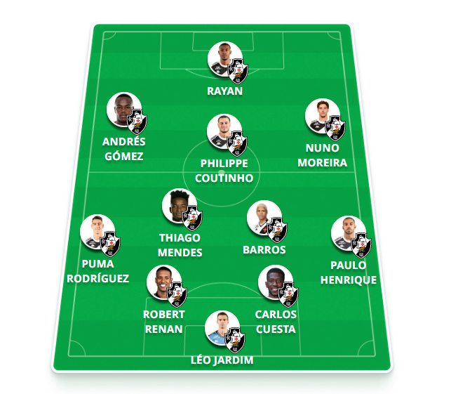 Escalação provável: Léo Jardim, Paulo Henrique, Carlos Cuesta, Robert Renan, Puma Rodríguez; Thiago Mendes, Cauan Barros, Coutinho; Nuno Moreira, Andrés Gómez e Rayan.