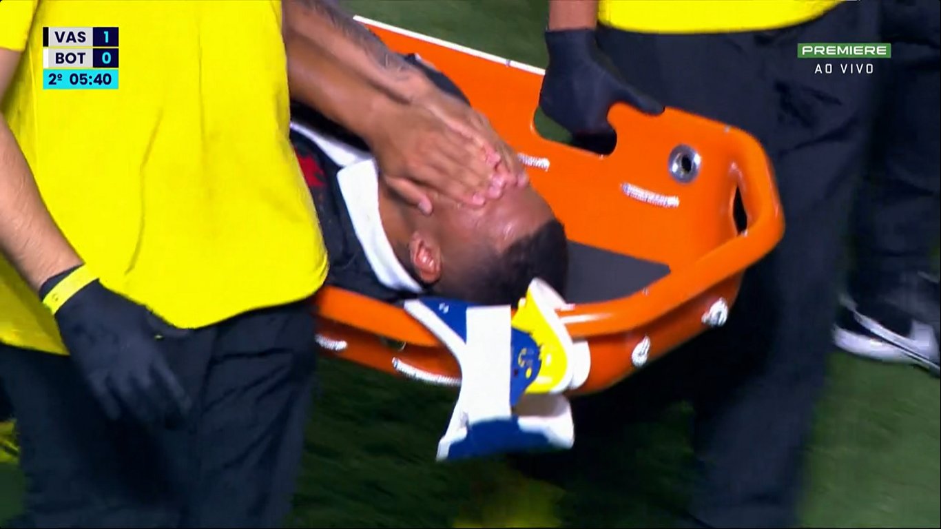 Foto mostra Erick Marcus saindo de campo chorando após se lesionar