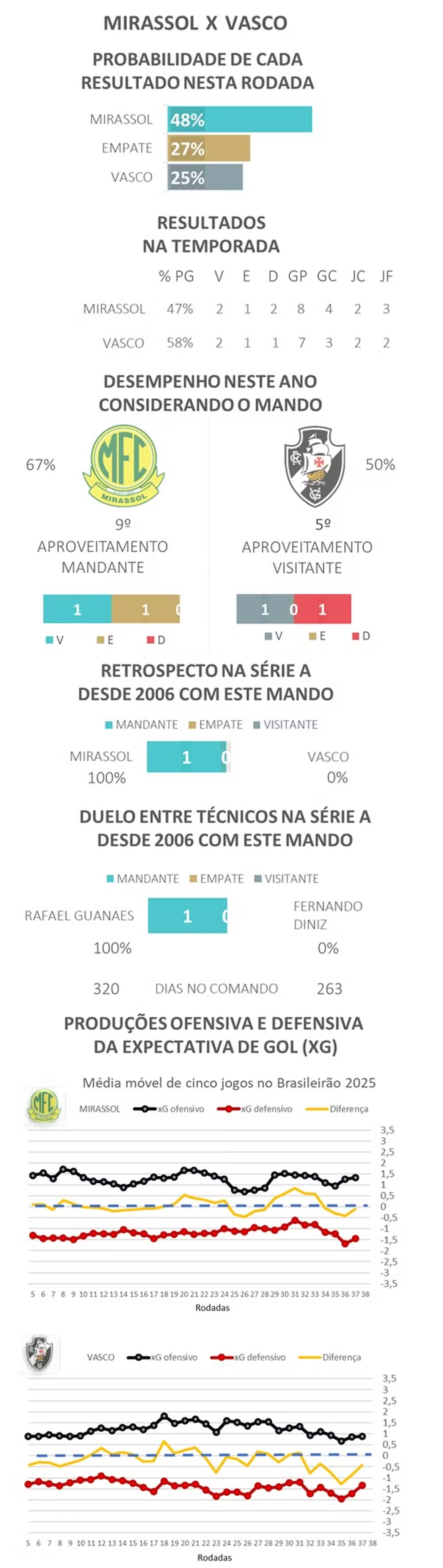 Na comparação entre as equipes, o Mirassol sobrou defensivamente: marcou 63 gols (terceira maior marca) enquanto o Vasco fez 55 (quinta maior marca), apenas oito gols de diferença, enquanto defensivamente o Mirassol sofreu 39 gols (quinta melhor marca), e o Vasco levou 60 (terceira pior marca), diferença de 21 gols (54% a mais).