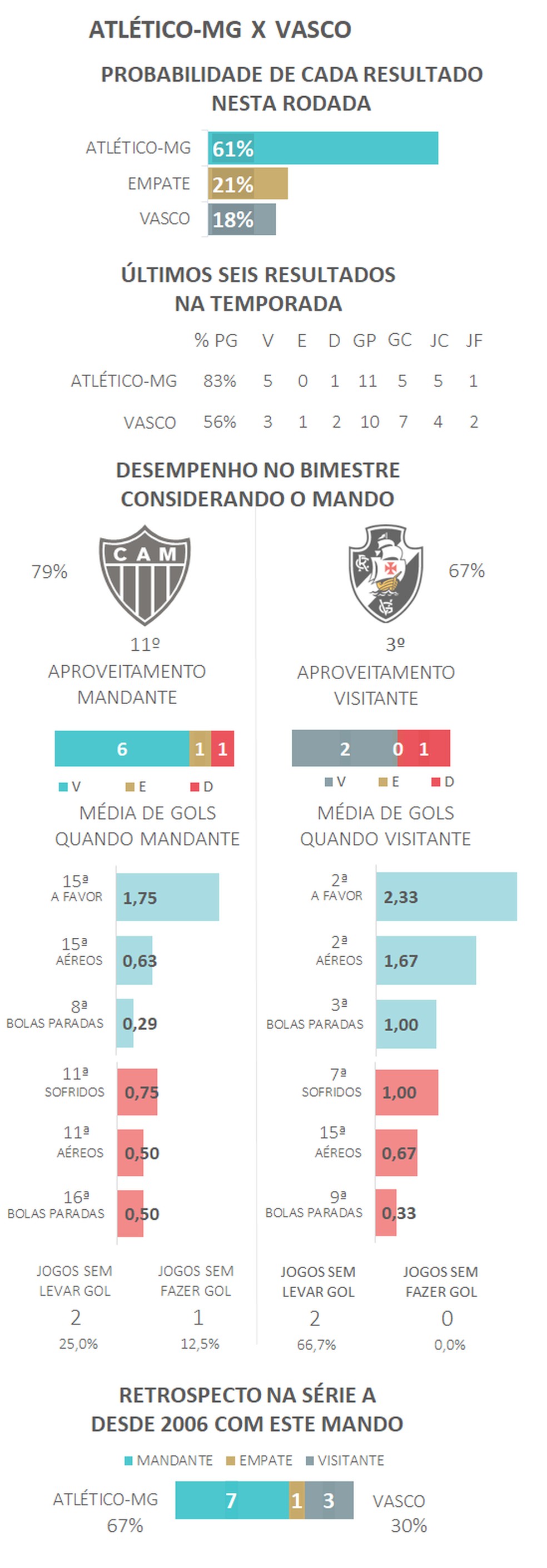 Desde o início do ano, o Atlético-MG está sob intensa pressão: primeiro precisou conquistar em campo sua vaga na fase de grupos da Libertadores, depois seu técnico reclamou publicamente de decisões tomadas pelo comando do clube. Como um todo, o clube mineiro lidou muito bem com essa pressão: se classificou na Libertadores, conquistou o título do Mineiro, e a direção, aparentemente, aceitou que o plano é amplo, problemas serão enfrentados, e as decisões, tomadas de forma equilibrada nos momentos mais desafiadores. Se for realmente para valer a manutenção do técnico Eduardo Coudet, essa serenidade tem potencial para ser contagiante e gerar frutos. Parece ser a mesma trilha desenvolvida no Vasco, eliminado pelo Flamengo nas semifinais sem prejuízo ao trabalho estabelecido por Maurício Barbieri. Só isso tudo já é um atrativo e tanto para este jogaço. O Atlético-MG tem o quinto melhor desempenho da temporada (74%), e o Vasco, o 14º (60%). Será um excelente teste para a defesa do Vasco, que não sofreu gol em nove dos 15 jogos que disputou (60%), segunda melhor marca, pelo Carioca e pela Copa do Brasil, da qual foi eliminado pelo ABC nos pênaltis. O Atlético-MG não levou gol em seis dos 18 jogos (33%). É na instabilidade defensiva do Atlético-MG que está a esperança para o vascaíno, principalmente no jogo aéreo, já que sem contar pênaltis e faltas diretas, o Vasco fez os últimos oito gols usando bolas altas, e o Atlético-MG sofreu assim seis dos últimos dez. O Atlético-MG fez sete dos últimos dez usando jogadas aéreas, mas o Vasco só sofreu três de dez pelo alto.