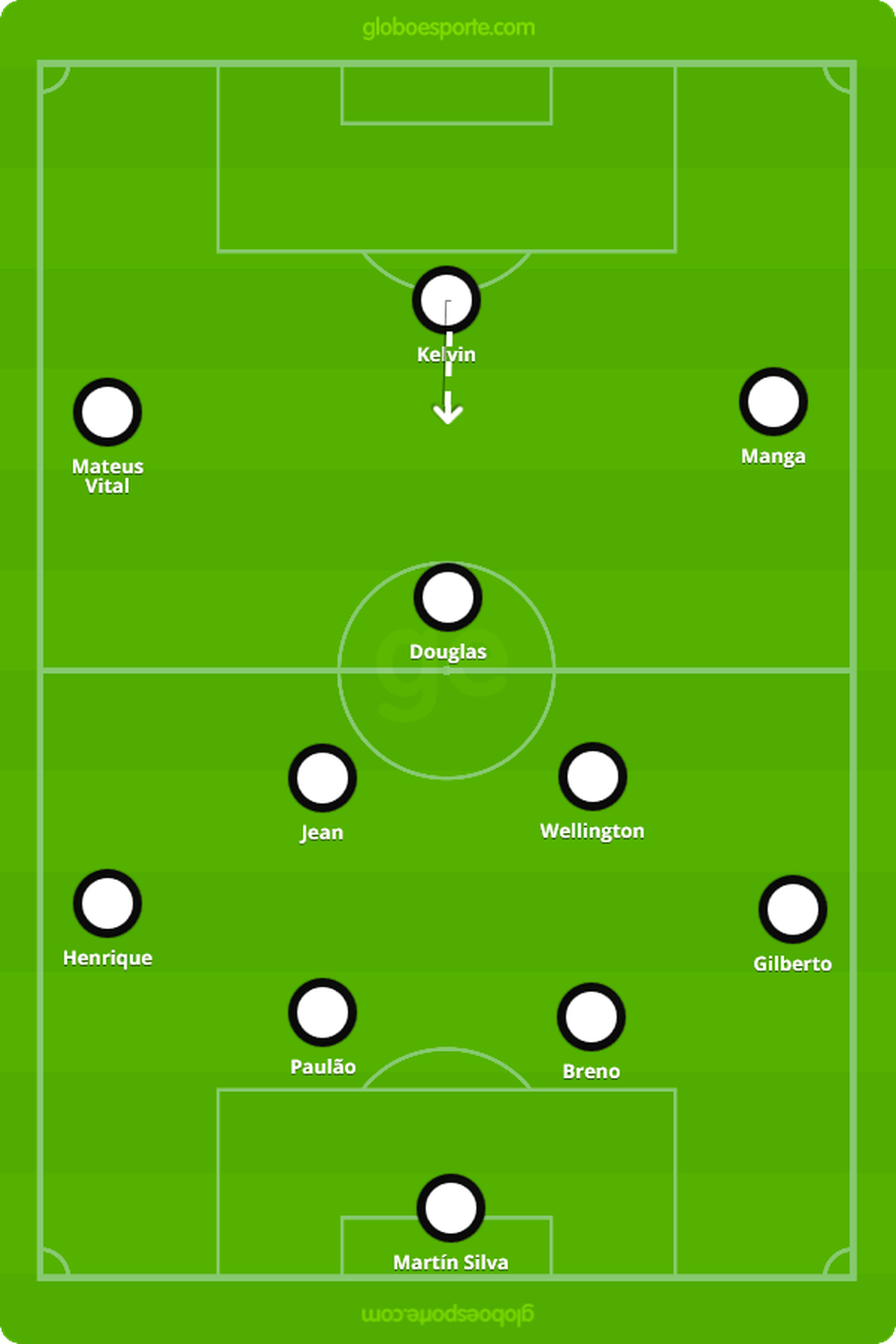 Manga recebeu uma oportunidade entre os titulares após a atuação crucial na virada sobre o Fluminense, na rodada anterior. Ele, no entanto, não fez o papel de Fabuloso. Atuou mais pela ponta direita, enquanto Kelvin jogou mais centralizado. Com características diferentes e 10cm a menos de altura do que o veterano (1,75cm x 1,85cm), o atacante era mais um “falso 9” que um centroavante. Esta não foi a única alteração de Milton com relação ao time que venceu o o clássico. Yago Pikachu deu lugar ao volante Wellington, que fez sua estreia com a camisa vascaína.
