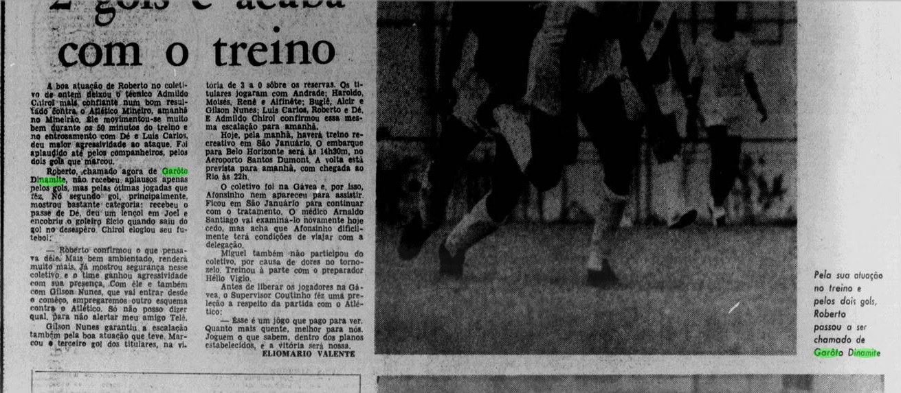 Em matéria assinada por Eliomario Valente, estava lá: "Roberto, agora chamado de 'Garoto Dinamite', não recebeu aplausos apenas pelos gols, mas pelas ótimas jogadas que fez". E uma curiosidade extra: o treino foi na Gávea.