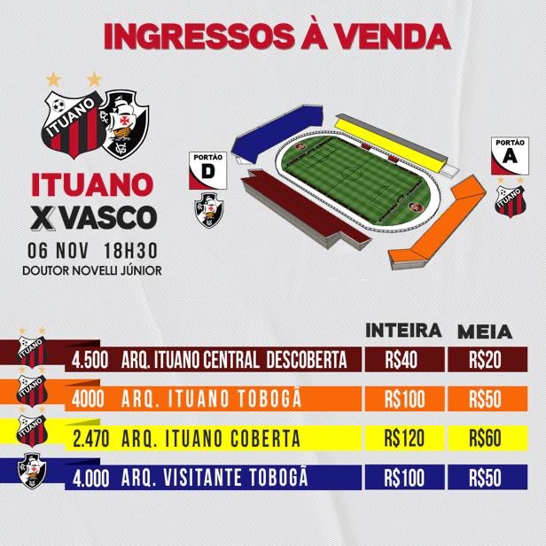 INGRESSOS! O Ituano disponibilizou 4.000 ingressos pra a torcida vascaína. A venda online será feita pelo site do Ituano, a partir de quinta-feira.