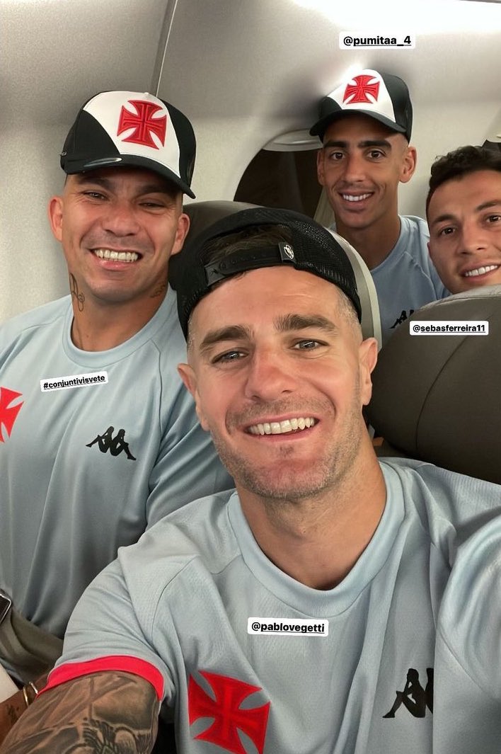 Já no avião, Medel posa ao lado dos gringos do Vasco