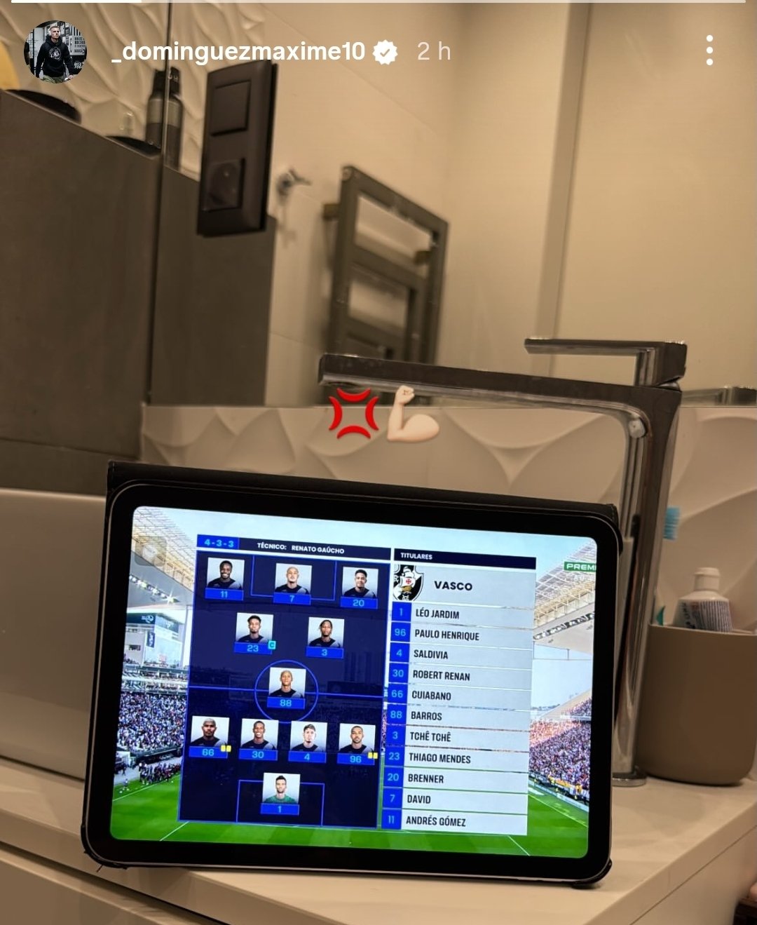 Maxime Domínguez publicou no seu Instagram que estava assistindo ao jogo do Vasco.