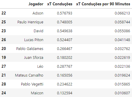 Usando o modelo Expected Threat (post nos destaques do meu perfil o explica), conseguimos ter essa noção de quais jogadores levam a bola a regiões mais perigosas do adversário através de conduções.