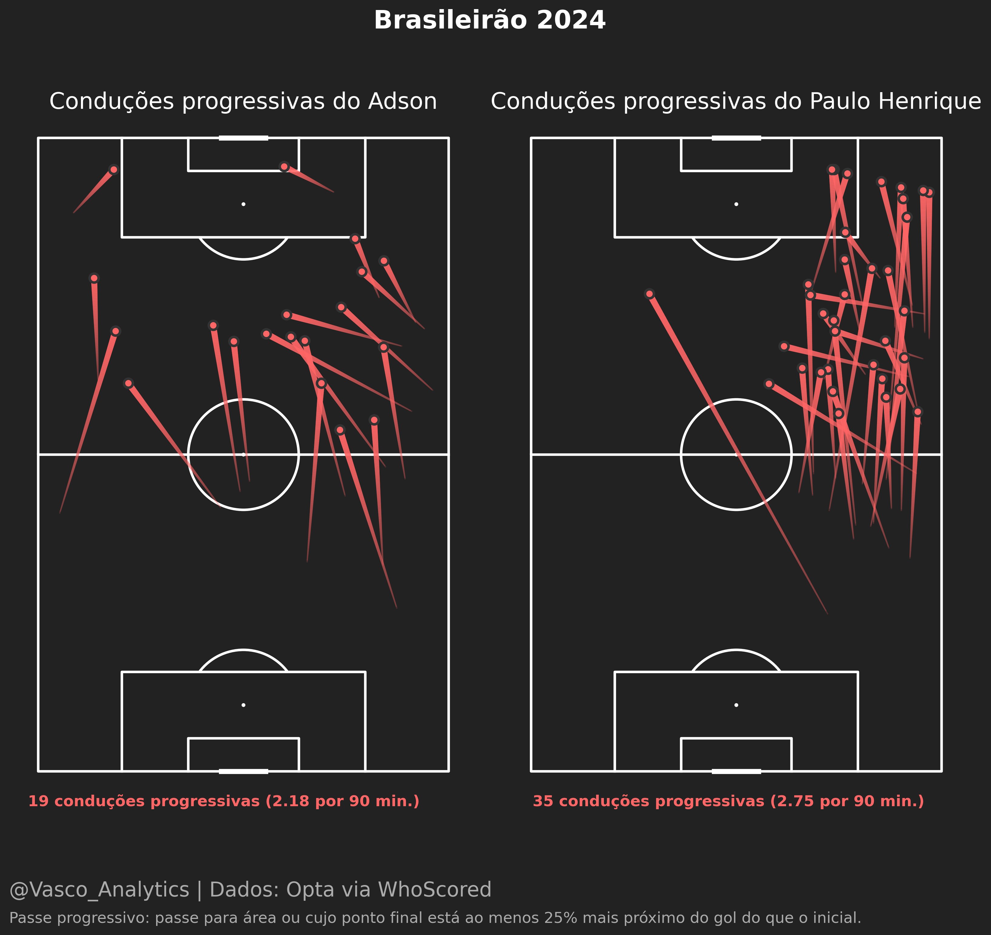 Dá pra perceber bem como o Adson tem a tendência de puxar a bola pro meio a partir das laterais do campo. o PH, por outro lado, conduz bem mais pelo corredor, mas também tem algumas conduções puxando para o meio.