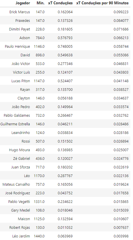 Segue a lista, com os rankings ajustados pelo xT criado por 90 minutos. Apenas jogadores com > 540 minutos jogados: