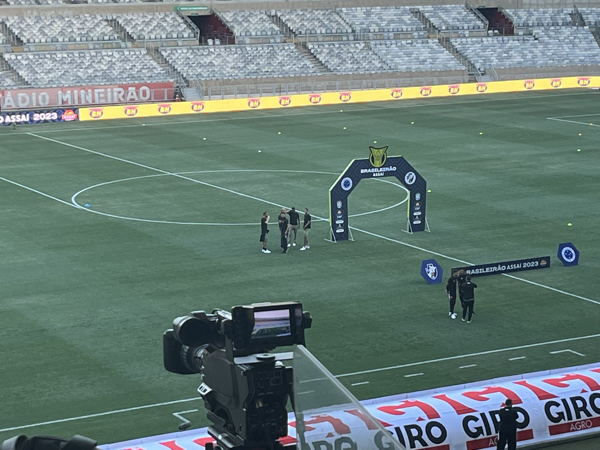 Jogadores do Vasco no gramado do Mineirão ainda sem roupa de aquecimento. Praxedes é um deles.