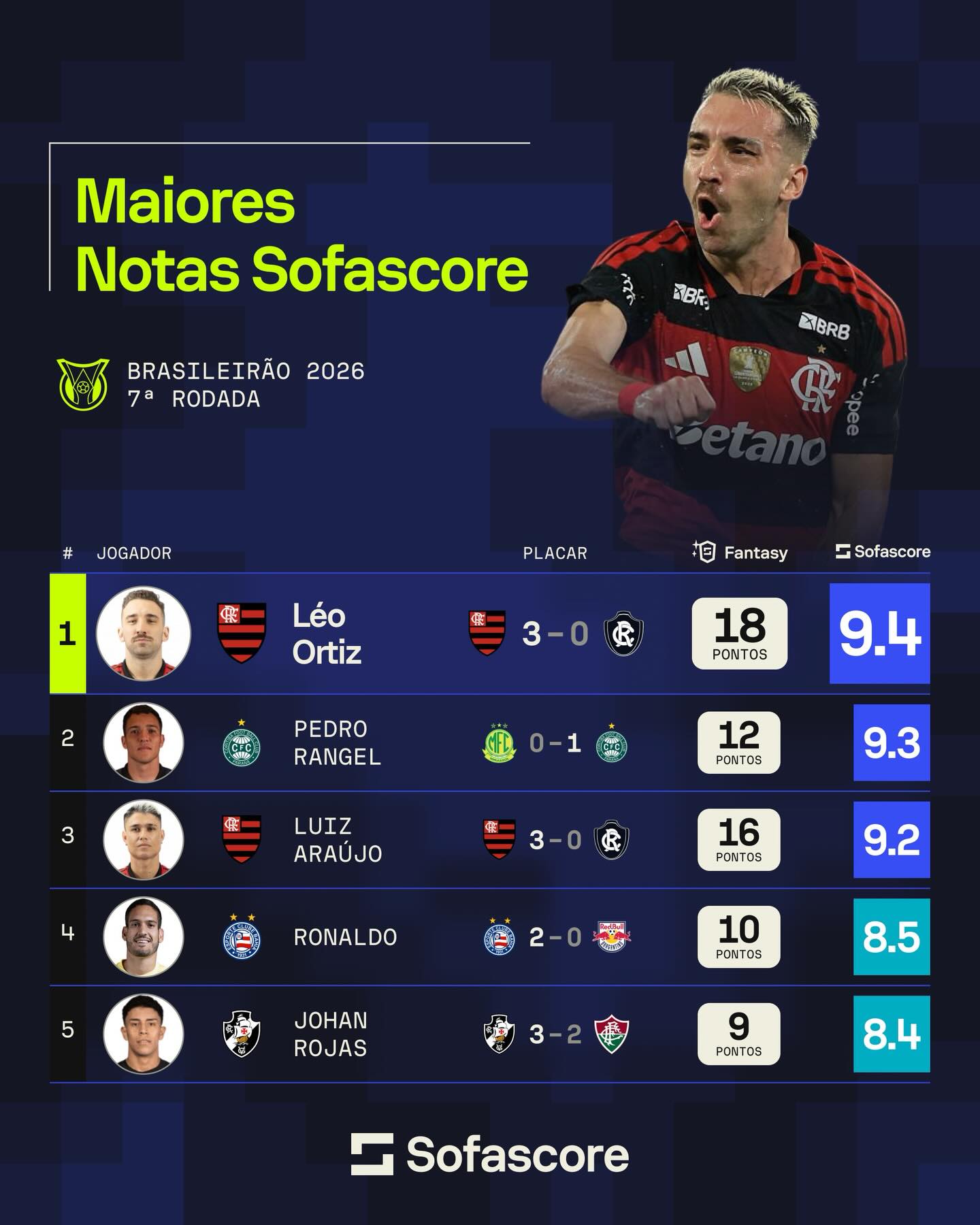 Os jogadores com as maiores Notas Sofascore da 7ª rodada do @Brasileirao 2026! 🔥🔥