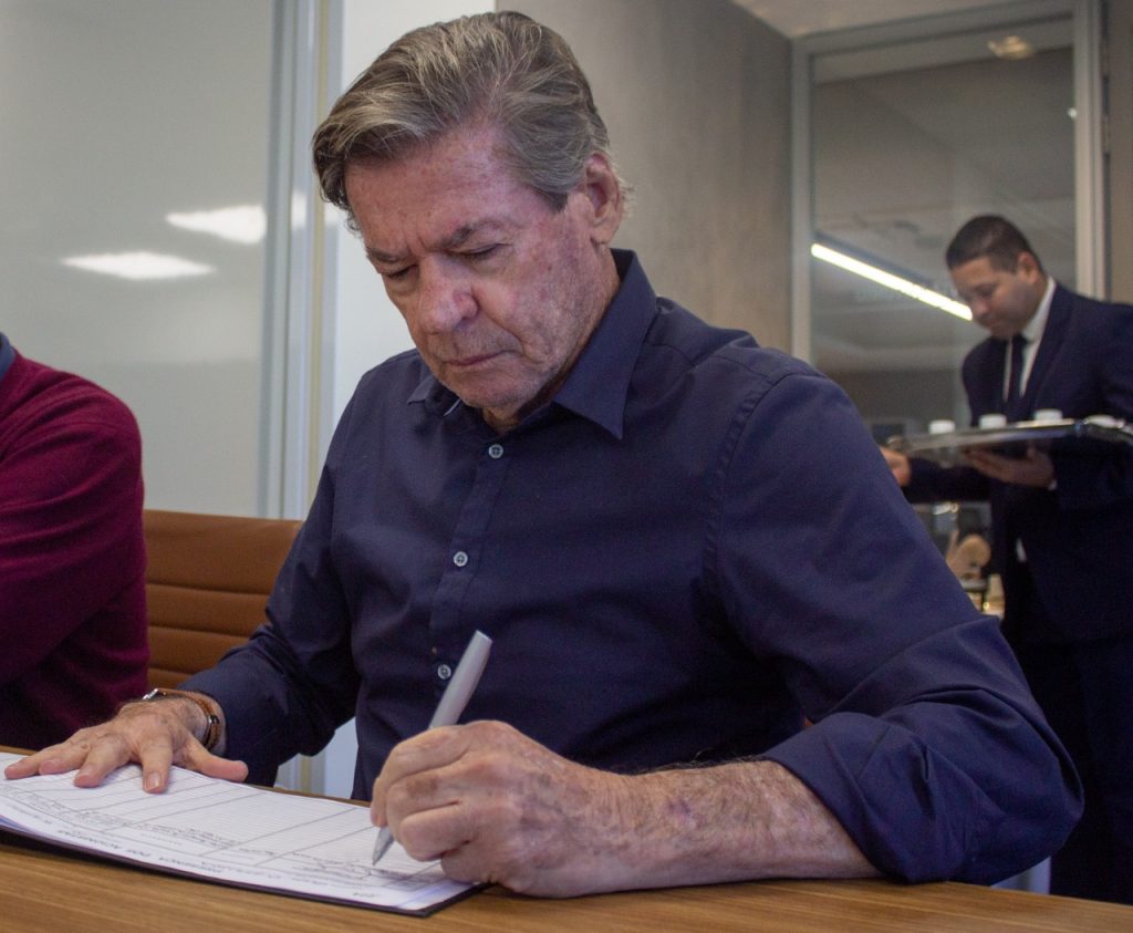 O presidente Jorge Salgado assinando o contrato da transferência de 70% do futebol do Vasco da Gama para a 777 Partners.